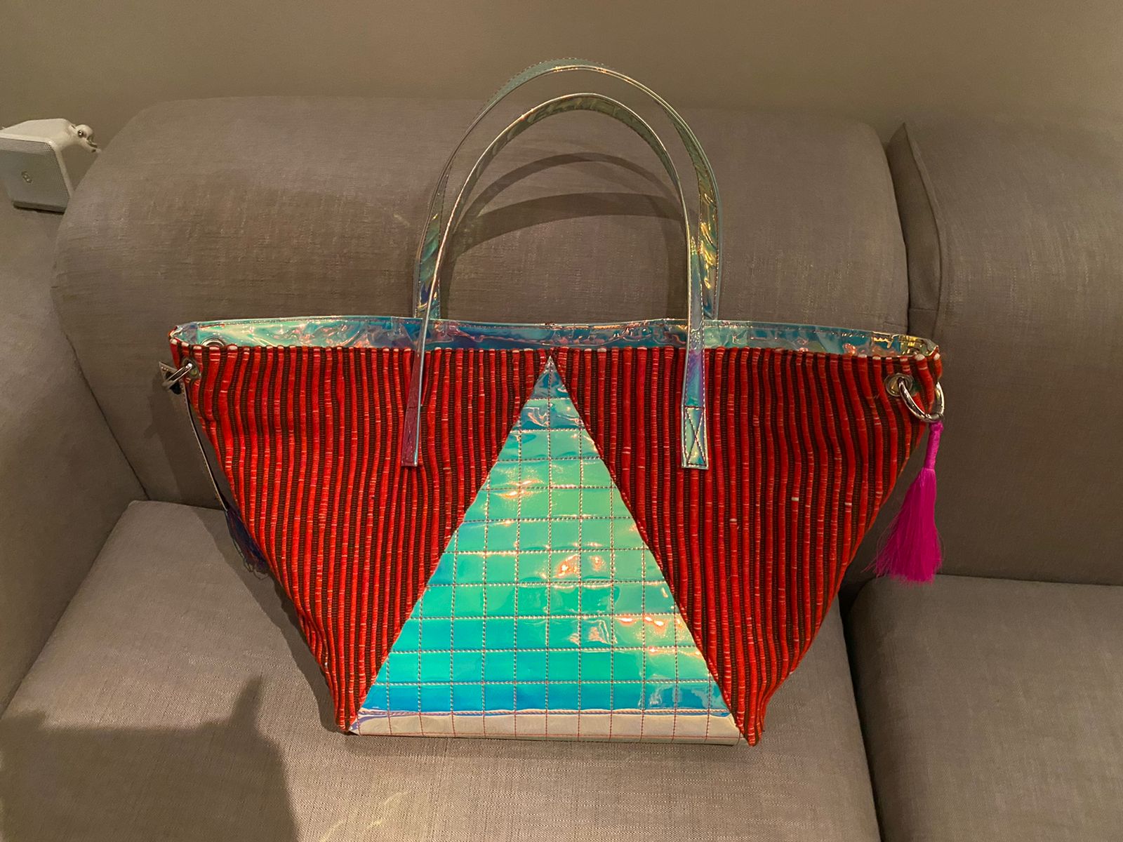 An extra large tote bag with a zipped inner pocket. The shell is made using alternating triangles of handwoven fabric and quilted iridescent faux patent leather.