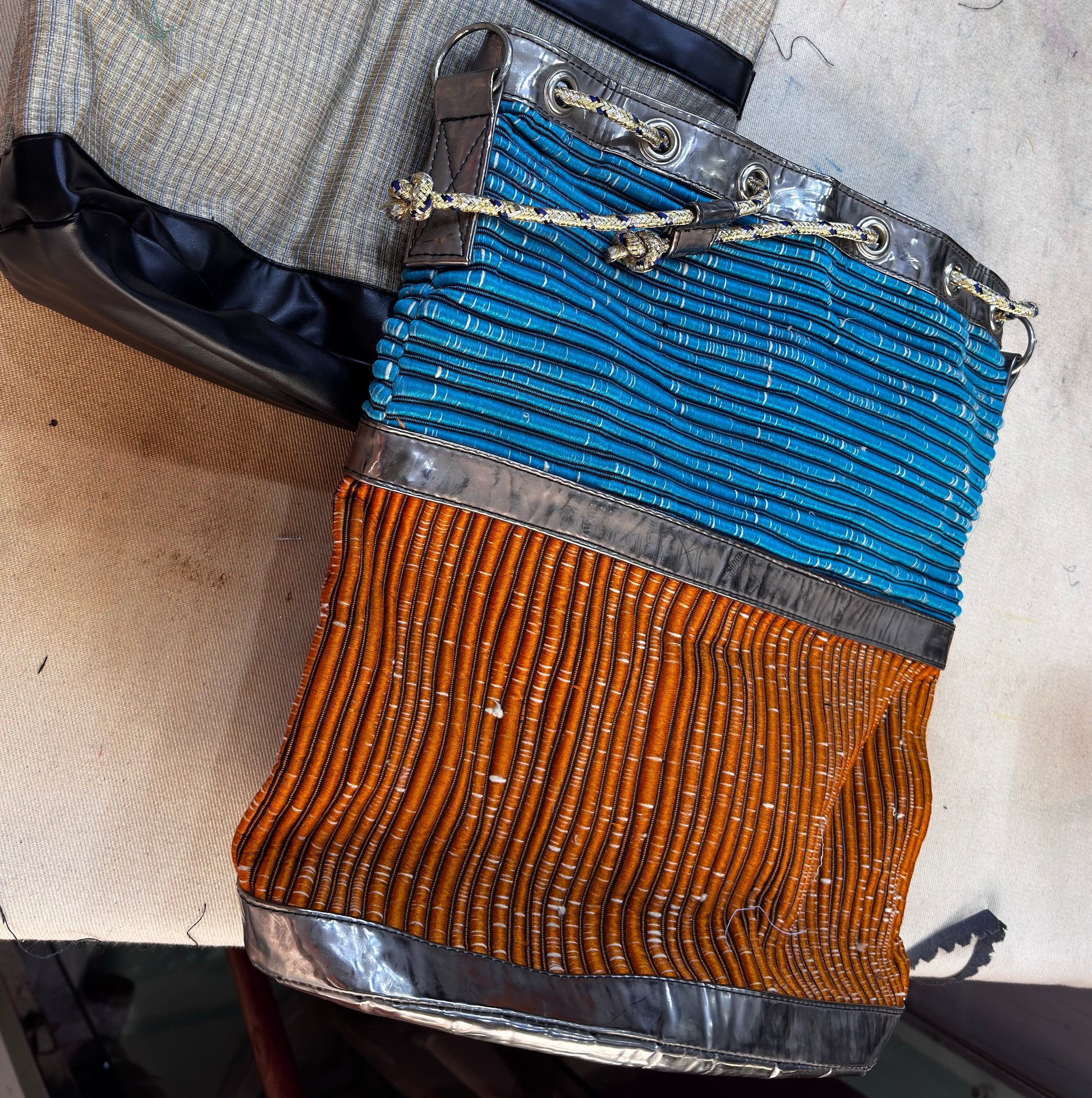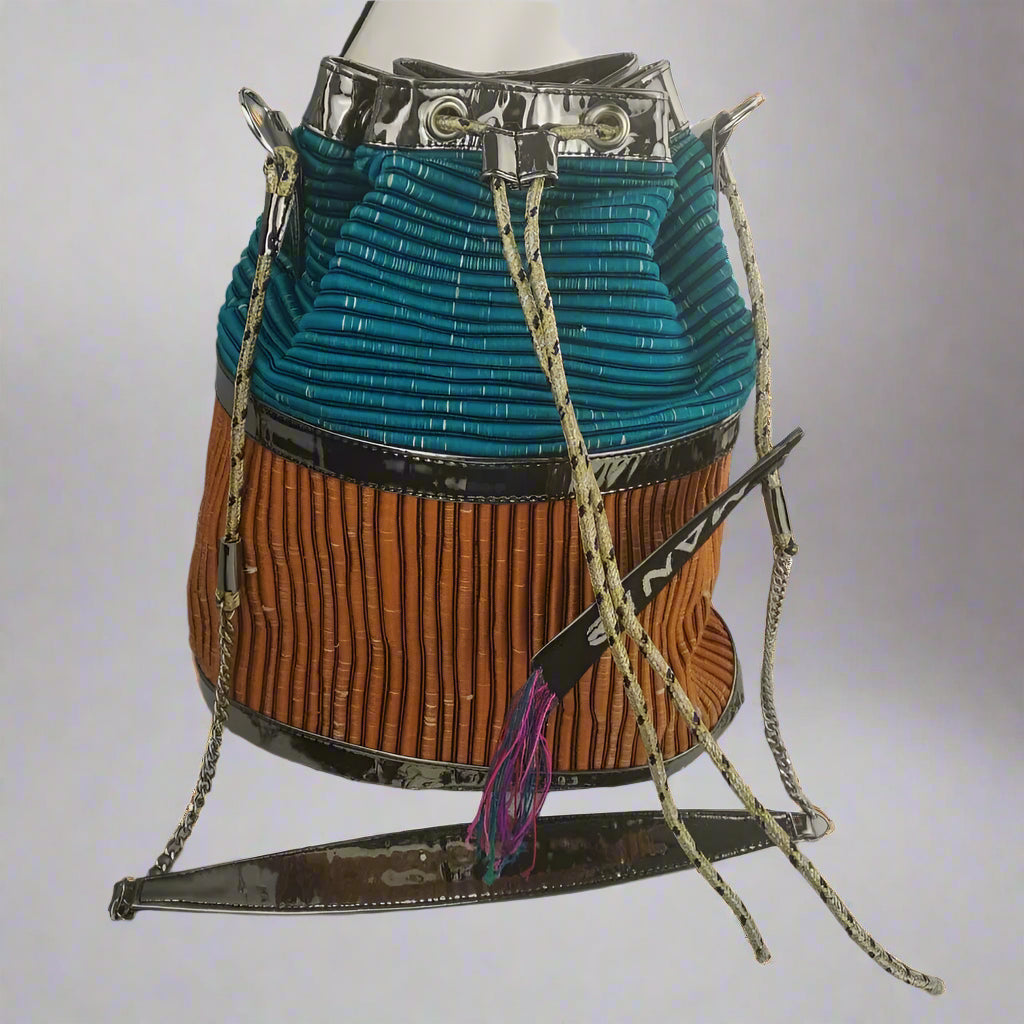 Medium sized bucket bag with drawstring closure and zippered inner pocket. The shell fabric is handwoven cotton and iridescent patent faux leather.